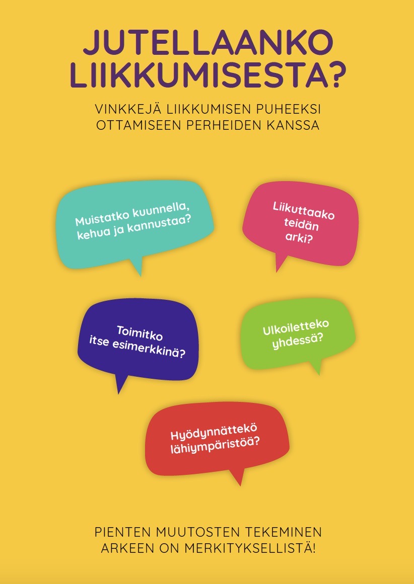 Liikkuva varhaiskasvatus ja Liikkuva perhe ovat tuottaneet työkalun, josta saa vinkkejä liikkumisen puheeksi ottamiseen perheiden kanssa. Liikkumisen puheeksi ottamisen -työkalussa on hyödynnetty liikkumisen edistämisen mini-interventiomallia.